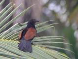 The Thattekad Bird Sanctuary is located in the peninsula formed in joining of Idamalayar and Periyar rivers. The wild part of sanctuary called “Forest” by the staff contains three important parts: open water, foothills forest, and large-leaf forest in the rivers floodlands. There are no birds in water, probably because water is a bit. Or probably not a season. The foothills forest is very tall trees staying between rocks. Branches of trees up to 15 meter are almost absent. I was going in this forest and seeing and hearing nothing. Only very large Squirrel slowly moved from one tree to another, also it sounded the first calls which I heard here. By the way this sound is similar to the sound of Red Squirrel. I was going slowly in full silence because I was expecting to view or hear any of birds. But they were absent. But once the flock of medium-sied black birds very quickly and with sharp sounds moved from crown of one tree to another one. I of course nothing noticed. Moreover, it was [...... read more ]